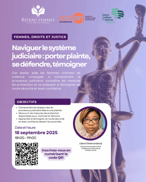 Cet atelier aide les femmes victimes de violence conjugale à comprendre le processus judiciaire, connaître les mesures de protection et se préparer à témoigner en toute sécurité et avec confiance.