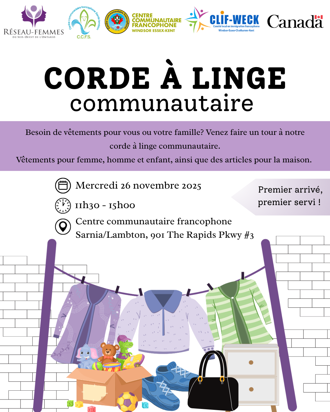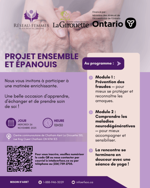 Centre communautaire de Chatham-Kent La Girouette 150 King West, Chatham, Ontario, CanadaNous vous invitons à participer à une matinée enrichissante. Cliquez ici pour vous inscrire ou contactez-nous par courriel à intake@rfsoo.ca ou par téléphone au (226) 759-2705.